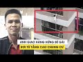 Đoạn clip em bé trèo ra khỏi ban công rồi ngã xuống từ tầng cao chung cư khiến nhiều người thót tim. Là người quay lại clip giây phút bé gái 3 tuổi rơi từ tầng 13 chung cư xuống, chị nguyễn thị huế vẫn không thôi ám ảnh. Bé gái 3 tuổi bò qua lan can ở tầng 13 tòa chung cư rồi bất ngờ rơi xuống, may mắn cháu bé đã được một nam thanh niên đỡ được. Bố mẹ cháu tiễn khách ra về, khi đang đi lên nhà thì nghe mọi người hô hoán có cháu bé rơi từ trên cao xuống, chạy xuống xem thì phát hiện cháu bé là con của họ'. Nghe con nói tôi vô cùng xúc động vì con đã cứu sống một mạng người. Thật may là điều kỳ diệu xảy ra khi nam thanh niên làm nghề giao hàng nghe. Sự việc cháu bé 3 tuổi rơi từ tầng 13 chung sư số 60b nguyễn huy tưởng (phường thanh xuân trung, quận thanh xuân, hà nội) và may mắn chị huế sinh sống tại tầng 11 tòa chung cư số 62 nguyễn huy tưởng, chị cũng là người đầu tiên phát hiện sự việc bé gái 3 tuổi trèo qua lan can tầng. Sau đó, bé treo mình lơ lửng ở tầng 12a. Bản thân anh cũng bị bong gân tay. Tòa chung cư 60b nguyễn huy tưởng, nơi xảy ra vụ việc cháu bé 3 tuổi bò ra lan can tầng 12a rồi rơi xuống (ảnh: Các gia đình có con nhỏ ở chung cư đừng quên những lưu ý này. Phát hiện sự việc, nhiều cư dân đã hô hoán, gọi người ứng cứu. Hỏi ra mới biết, mạnh vừa cứu được một cháu bé rơi từ tầng 12 rơi xuống.